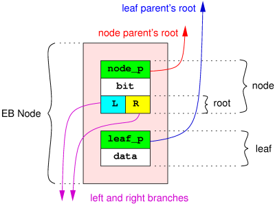 The structures were designed to be located at the very beginning of any structure making use of EB trees. It is important for cache efficiency and memory access time that the EB tree data are located at the beginning of a CPU cache line, especially the 4 first pointers.